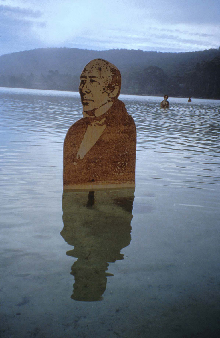 16 pyrographically inscribed lifesize ply figures of British people who collected Tasmanian Aboriginal people and cultural material placed in tidal flat at Eaglehawk Neck, Southern Tasmania