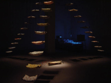pillows, hair, laser print transfers, bark, motor, ekg reading monitor, dvd recording,bed, cotton