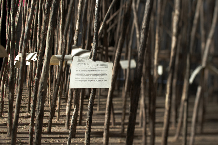 Tea tree sticks, book pages from Clive Turnbull’s book; Black War (1948) dipped in wax